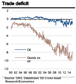 "We are therefore sceptical that this improvement can continue but in the very short term, at least, it will probably will. We predict the total deficit to widen only very slightly to £1700mn from £1601mn", says Societe Generale.