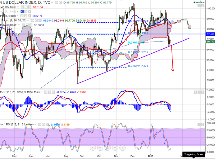 - The index has taken support near trend line and started to jump from that level. It is currently trading around 96.71.