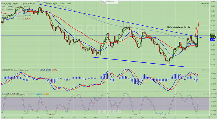 - US oil breaks major resistance $31.80 and jumped till $32.16 at the time of writing. It is currently trading around $32.13.
