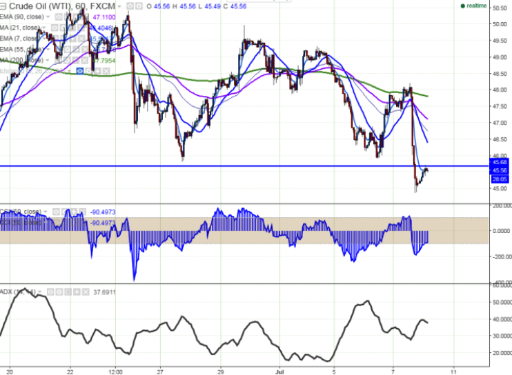 - US Oil has broken major support $45.80 yesterday and declined till $44.86 after weaker than expected US crude oil inventories.