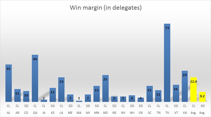 - Biggest win margin for Sanders has been 16 and that is in his home state Vermont, where he grabbed all. While Clinton won 73 more delegates in Texas.