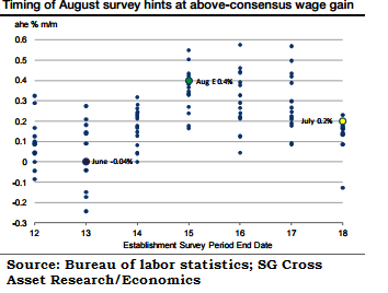 "Looking ahead, ever-tightening labor market conditions are expected to propel the annual growth of private hourly earnings to 2.4% by Q4 and to 2.9% by the end of 2016. The return to a more typical four-week interval between survey periods, however, probably left the mean work span of all private employees six minutes shorter at 34.5 hours in August", says Societe Generale.