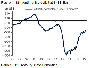 "US federal government annual budget deficit is expected to reduce by $58bn in 2015 versus FY 2014. We expect the deficit to narrower further in FY 2016 as employment and income gains drive growth in individual income tax receipts", estimates Barclays.