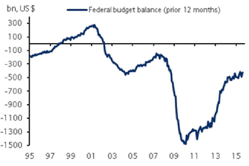 The US federal government reported a monthly deficit of $64.4bn in August, modestly wider than CBO projections ($62bn) and $64bn narrower than in August 2014. A large portion of this decline, however, was due to the time shifting of payments, according to CBO analysis. Adjusting for these calendar effects, the monthly deficit would have narrowed just $4bn from the year prior. Receipts were up 8.5% y/y, driven almost entirely by growth in income and payroll taxes withheld from workers' paychecks. Spending was down 14.8% y/y on a reported basis, but up 4.3% on a CBO calendar-adjusted basis.