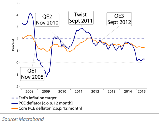The most recent inflation figures for July have shown the weakest annualized increase in prices since March 2011. The Fed's preferred measure of inflation, the PCE deflator, remained at 0.3% y/y in July, but the core measure fell to 1.2% y/y. This suggests that it may take longer for the headline figure to return to the Fed's 2% target. The slowdown of the Chinese economy, the devaluation of the yuan against the US dollar, and the worldwide decline in commodity prices could further delay the return of US inflation to its 2% target.