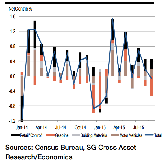 "Our retail control projection, if realized, would place the key input to government statisticians' goods-spending calculation over the July-September span 6.1% annualized above its Q2 average - the strongest performance since the spring of 2014", notes Societe Generale.