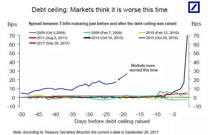 Investors are more worried about U.S. debt ceiling increase this year than any other year before. This chart from Deutsche Bank shows worried investors are already pushing short term yield higher and the spread between debt maturing before debt ceiling debacle and those maturing after has increased to the highest level compared to any other previous years. Short-term government debt maturing right after the September 29 debt ceiling deadline is now being priced with a yield of about 20 basis points above their counterparts that mature just before that date, according to an analysis by Deutsche Bank. The difference, or spread, has been rising as the deadline has neared (blue line in the chart above) and it is presently more elevated than at this point from past debt ceiling episodes.