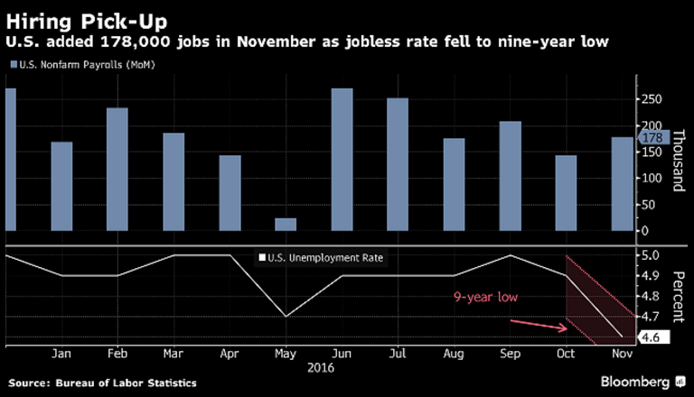 The U.S. unemployment rate fell to a nine-year low of 4.6 percent in November, as employers added another 178,000 jobs, data released by the U.S. Department of Labor showed Friday. Further, the labor market witnessed the departure of more people, following higher rate of retirement, lowering the number of working-age people in the labor force to 62.7 percent.