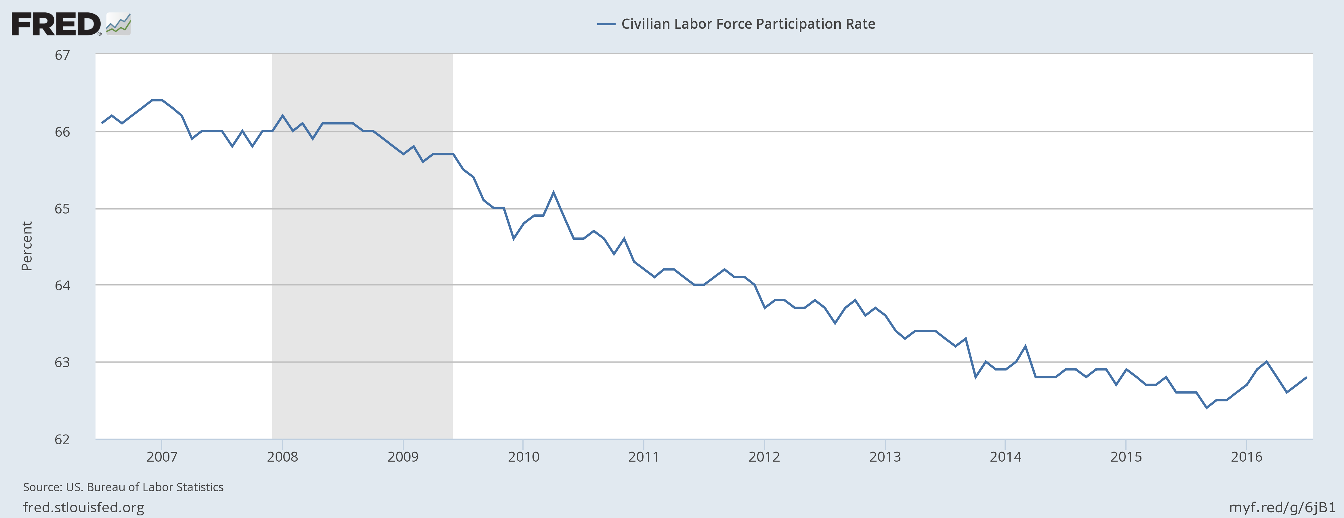 Actually, the way this rate is viewed is misleading. Unemployment rate drops not just because of increased employment, it drops when people leave the workforce, in other words when the participation rate drops. Since the 2008/09 crisis and from well before that, many people, as much 12.1 million has left the workforce due to frustrations, lack of skills, and technology takeover.