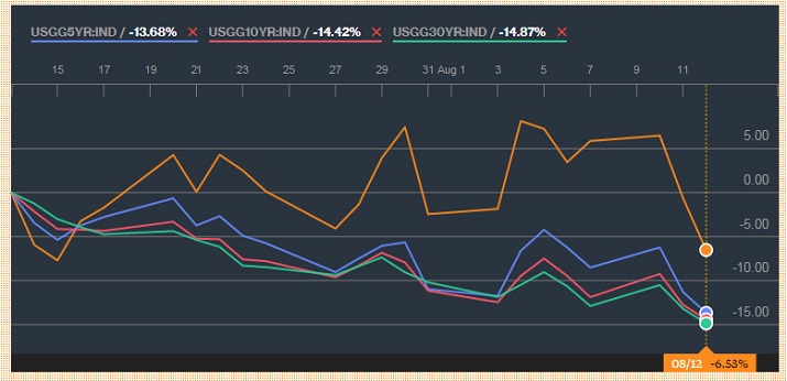 US treasuries have sharply gained since Tuesday, pushing yields down.