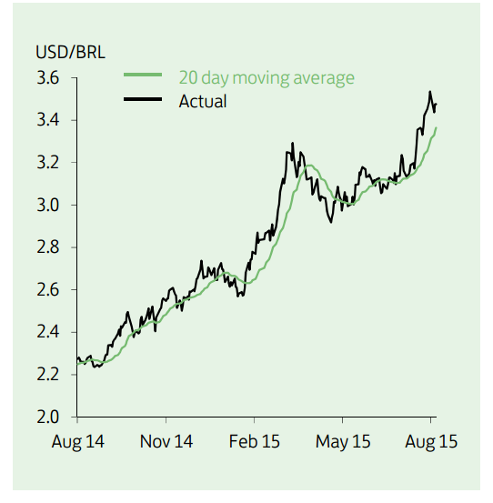 The BRL has been the worst performing EM currency this year with USD/BRL touching a near 2002 high in August of 3.5696. Internal and external factors have both added to depreciation pressures in recent weeks. Fears of a "hard landing" in China, combined with the recent depreciation in the CNY, and the threat posed by a Fed policy tightening, are expected to continue to weigh on the BRL.