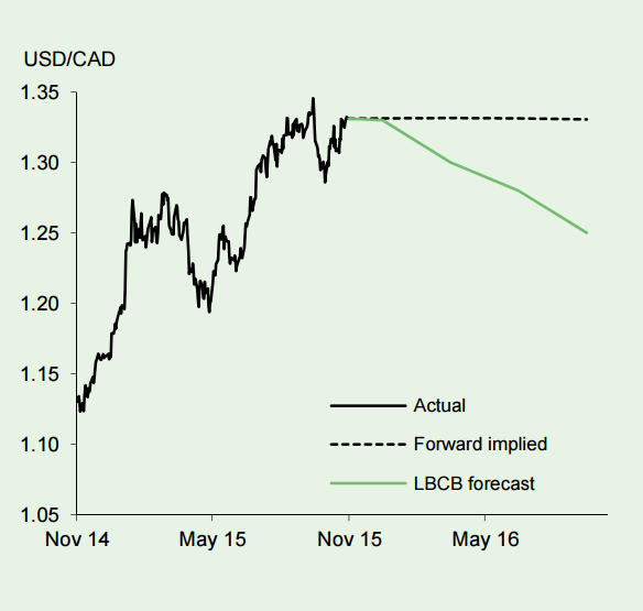 Signs that oil prices are stabilising and will pick up through next year could provide a further support for the 'loonie'. In the near term, there remains a significant risk that the CAD will fall further, particularly against the USD. However, it is close to a bottom and the most will probably start to appreciate gradually through 2016, reaching 1.22 against the USD by year end.