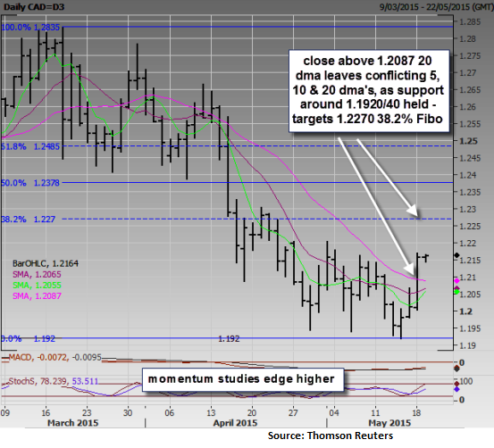Tight doji early in a slow start to trading in Asia, opened +1.2% 5, 10 & 20 dma's conflict, momentum studies edge higher Initial support is seen at 1.2100, 38.2% Fibonacci retracement and resistance at 1.2170