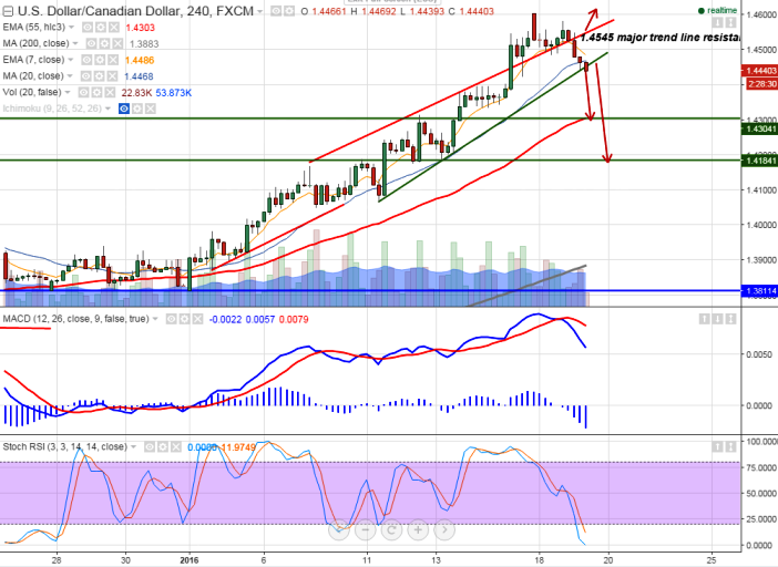 - Loonie has broken major trend line support 1.4450 and declined till 1.44393 at the time of writing. It is currently trading around 1.4418.