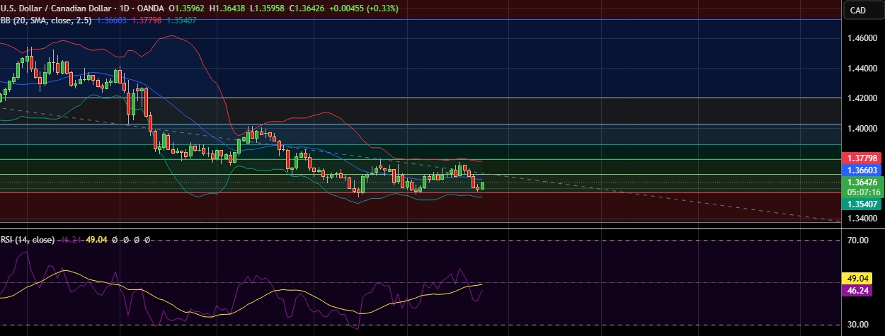• Support is seen at 1.3567(23.6%fib) and break below could take the pair towards 1.3548(Lower BB).