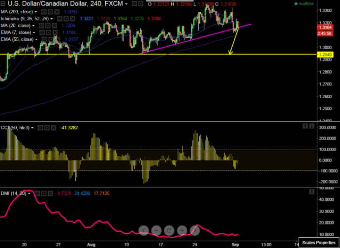 - Loonie breaks minor trend line support 1.3150 which confirms short term weakness, a decline till 1.3000/1.2950 cannot be ruled out.