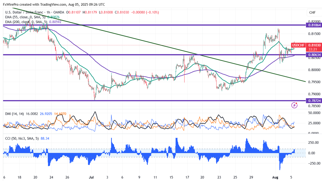 USDCHF holds above the 0.8100 level on board-based US dollar buying. It hits an intraday high of 0.81179 and is currently trading around 0.081012.