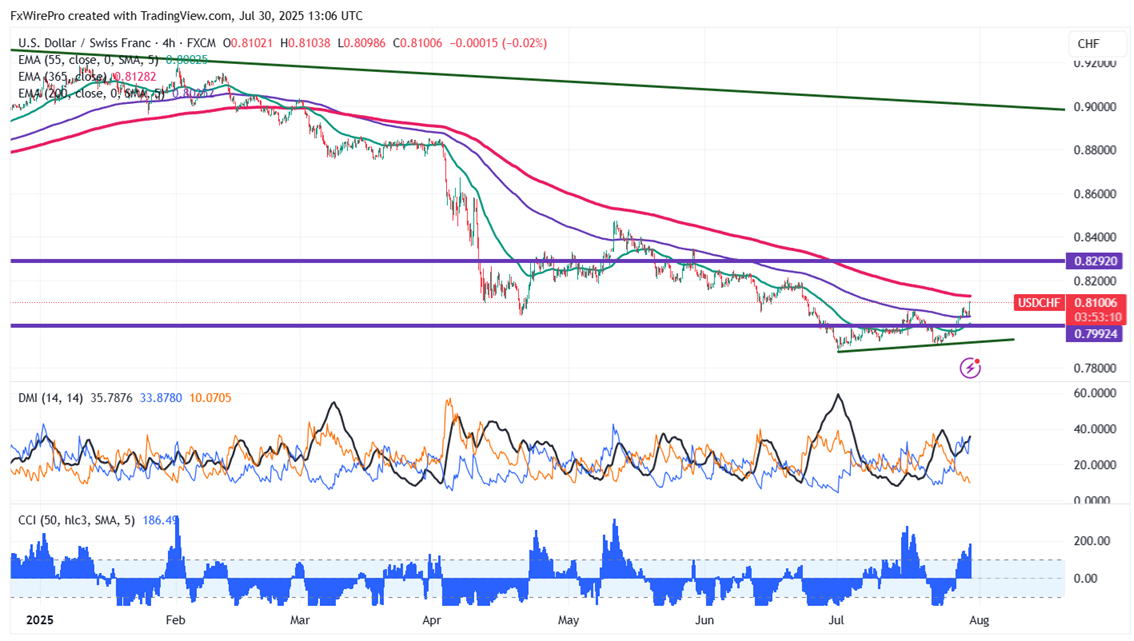 The pair is trading above the 55-EMA, 200 EMA, and below the 365 EMA on the 4-hour chart, indicating a mixed trend. The immediate resistance is at 0.8135 any break above targets 0.8170/0.8215/0.8250.