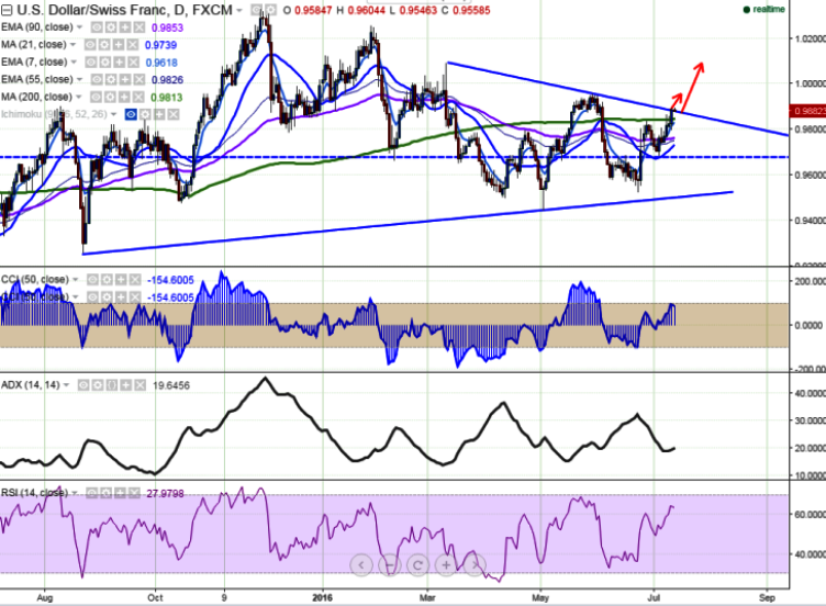 - USD/CHF broken trend line resistance yesterday and closed slightly above in daily chart. It is currently trading around 0.98850.