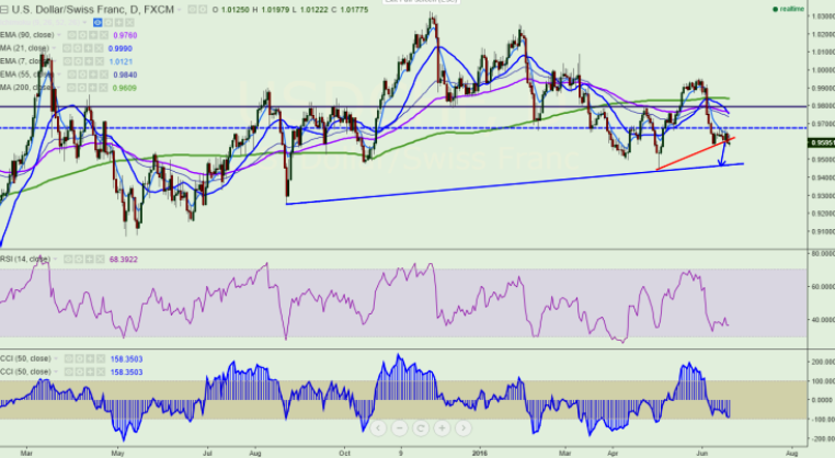 - The pair has formed temporary top around 0.9686 and started to decline from that level. It is currently trading at 0.95958.