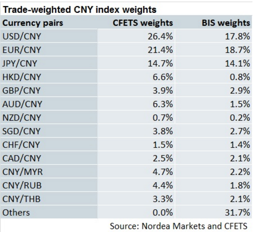 China has already de-pegged the CNY from the USD in 2005, though in practice, it was following closely the movements of the USD. Analysts see the new trade-weighted exchange rate index as a further de-peg of the CNY from the USD. Allowing the CNY to be driven by trade-weighted basket instead of the USD will indicate liberalization and matureness of the currency, added Nordea Bank.
