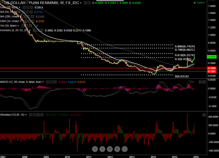 - USD/CNY has climbed up to 6.4583 this week from 6.400 which would be highest weekly depreciation since the week of surprise devaluation on Aug 11.