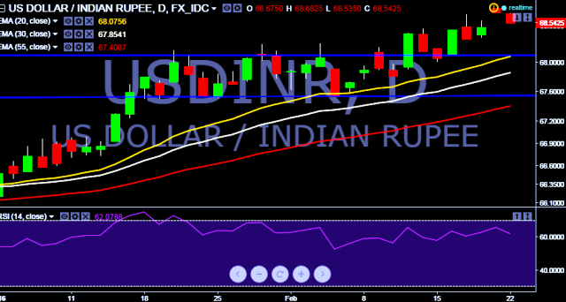 - USD/INR intraday bias remains bearish for the moment. Intraday trading range will remain in between 68.35 - 68.68 levels.
