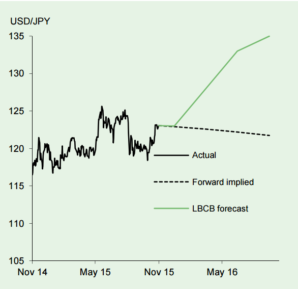 "We look for further weakening in yen to 135 before a likely subsequent recovery in late 2016 and into 2017", says Lloyds Bank.