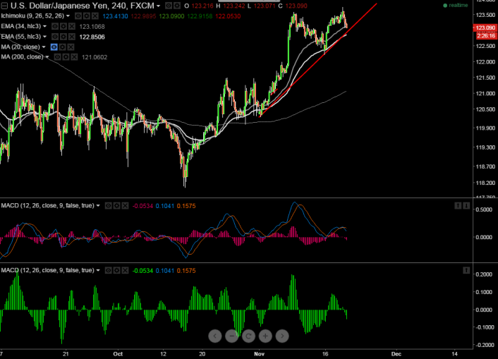 - USD/JPY has made a high of 123.75 and declined from that level. It is currently trading around 123.10.