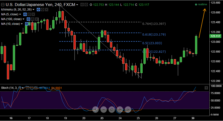- The pair has now managed to break above 123 levels and is currently trading at session highs by 123.10