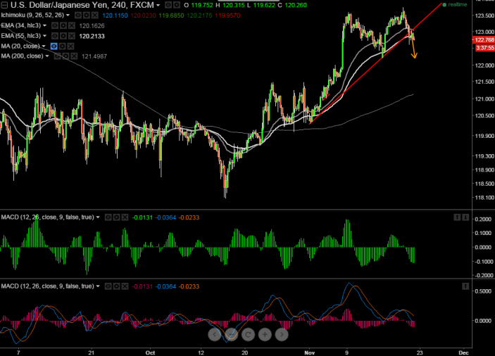 Potential reversal Zone -122.80 (trend line joining 120.25 and 122.22)