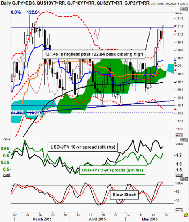 - USD/JPY next hurdle is upper 21-wk Bolli band at 121.60; 121.46 the on-close pivot