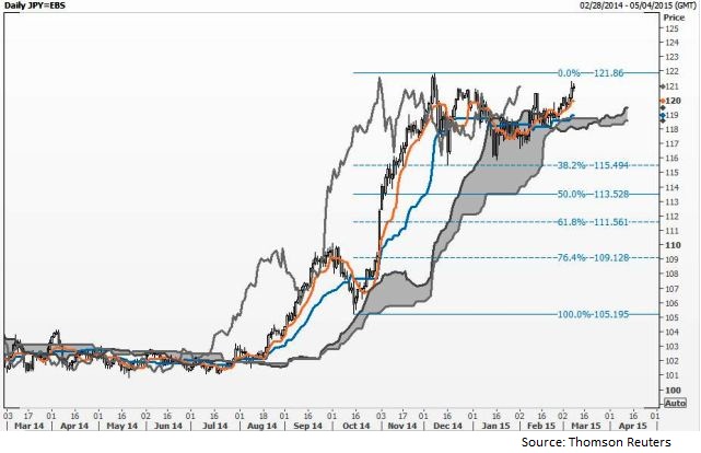 Scope for gains towards 121.86 - 2014 peak Traders are long at 119.65 for the 121.80 level Trailing stop raised to 120.30 to sustain profit Tenkan & kijun lines are aligned positively, shows upside potential