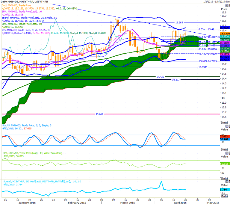 - Above daily cloud base MXN eyes down TrendLine 15.3901, upper 21-d Bolli 15.4573