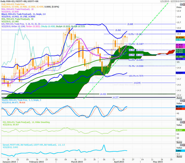 - USD/MXN resistance at daily pivot (15.4267), upper 21-h Bolli (15.47)