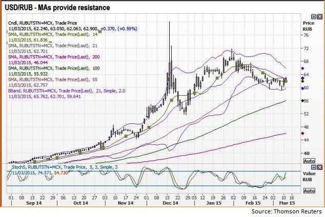 - USD/RUB testing resistance 62.70-75 where 21- and 55-DMA meet