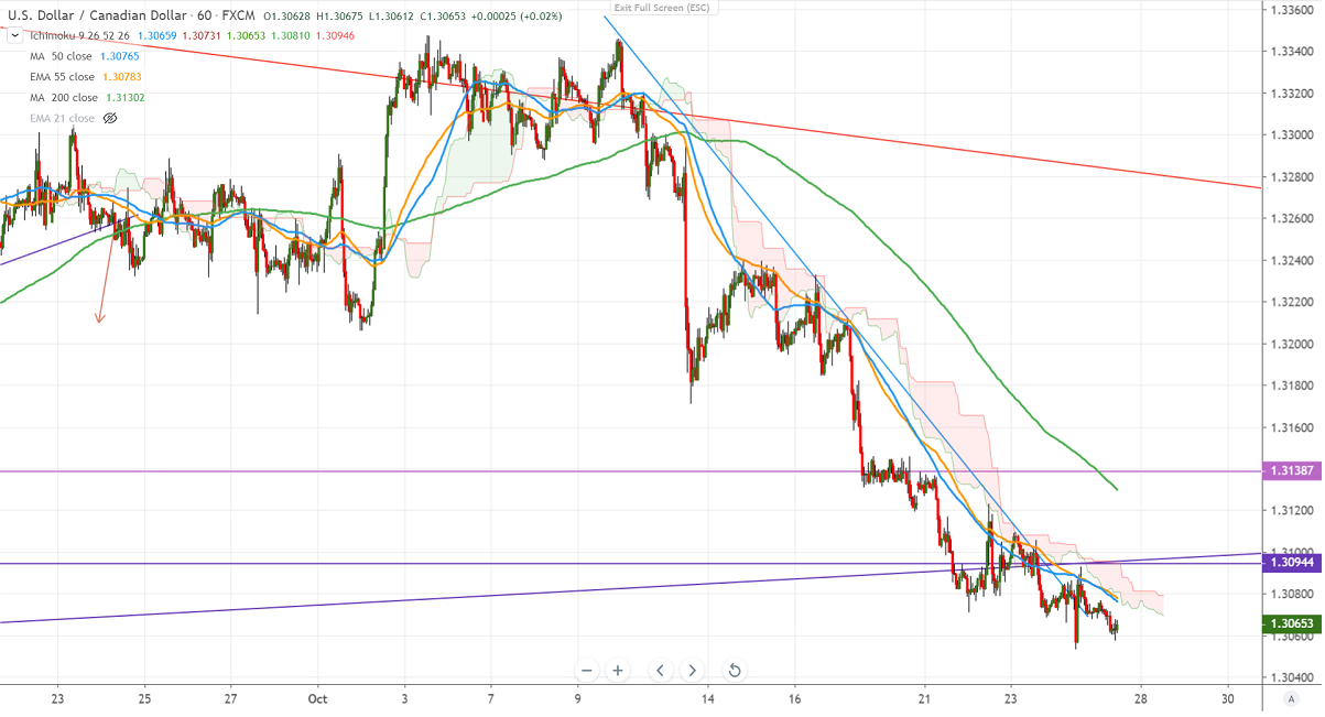 USDCAD continues to trade lower for 2nd consecutive week and declined more than 250 pips on account of broad-based dollar selling. DXY was trading weak due to dismal US economic data such as retail sales, ISM manufacturing index. This has increased the chance of a rate cut by the Fed this month's meeting. The pair hits low of 1.30525 and is currently trading around 1.30609.