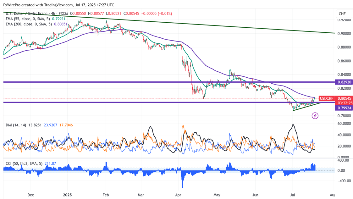 USDCHF trades higher on board-based US dollar buying.It hits an intraday high of 0.80639 and is currently trading around 0.80548. Intraday bias appears to be bullish as long as support 0.7990.