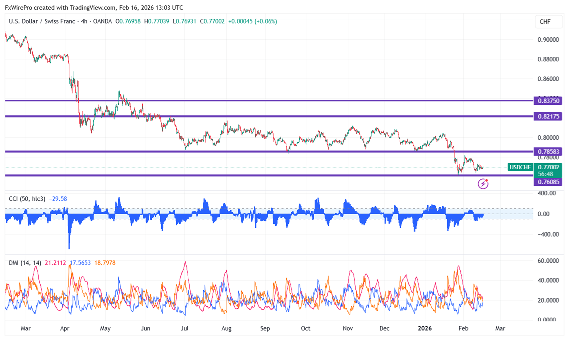 As US markets closed for President day, USDCHF traded flat. Having reached an intraday high of 0.77039, it is now trading at 0.77002.