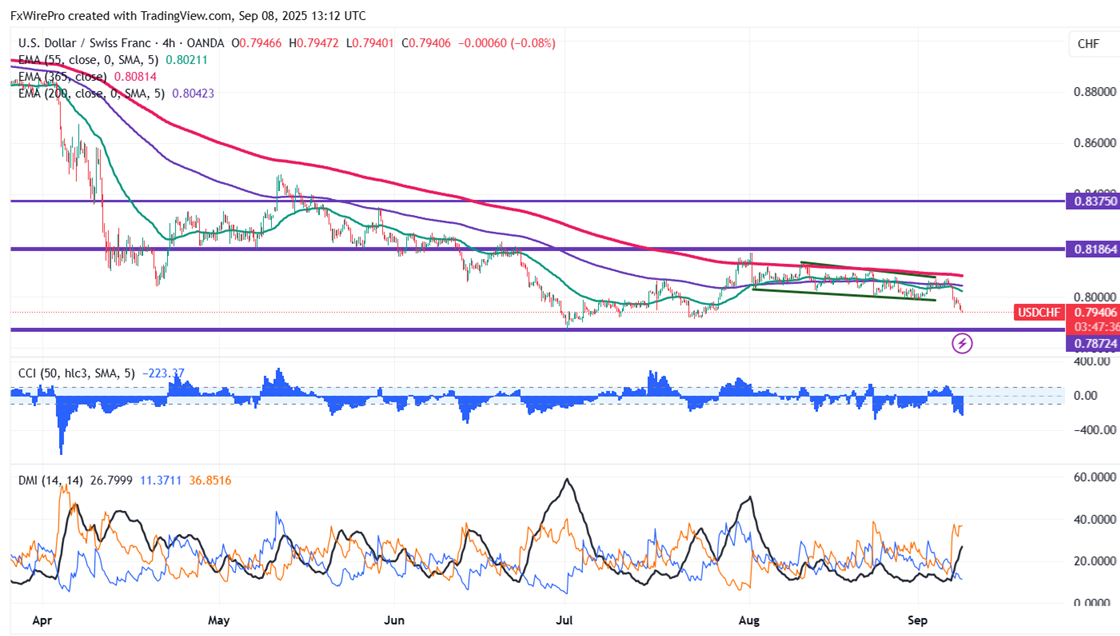 USDCHF trades well below 0.8000 as weak US jobs data increased the chance of a rate cut by the Fed. It hits an intraday low of 0.79442 and is currently trading around 0.79472.