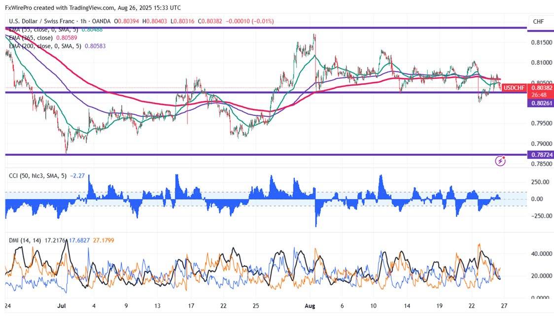 The pair is trading above the 55-EMA, below 2the 00 EMA and 365 EMA on the 1-hour chart, indicating a mixed trend. The immediate resistance is at 0.8065; any break above targets 0.8100/ 0.8135/0.8170/0.8215/0.8250.