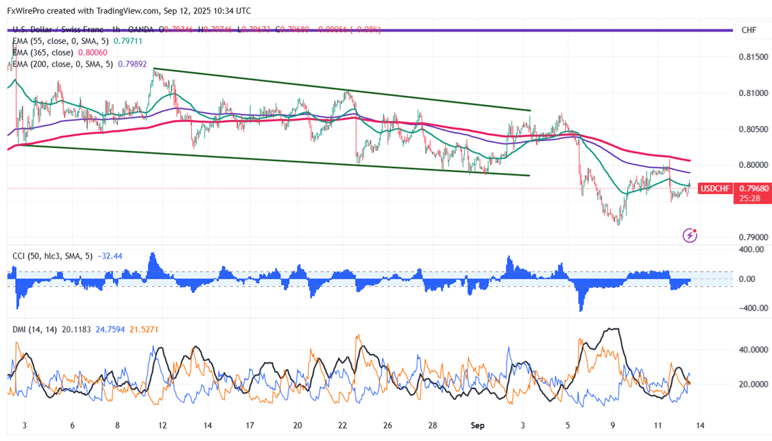 The pair is trading above the 55-EMA, below the 200 EMA, and 365 EMA on the 1-hour chart, indicating a weak trend. The immediate resistance is at 0.8000; any break above targets 0.8070/0.8090/0.8135/0.8170/0.8215/0.8250.