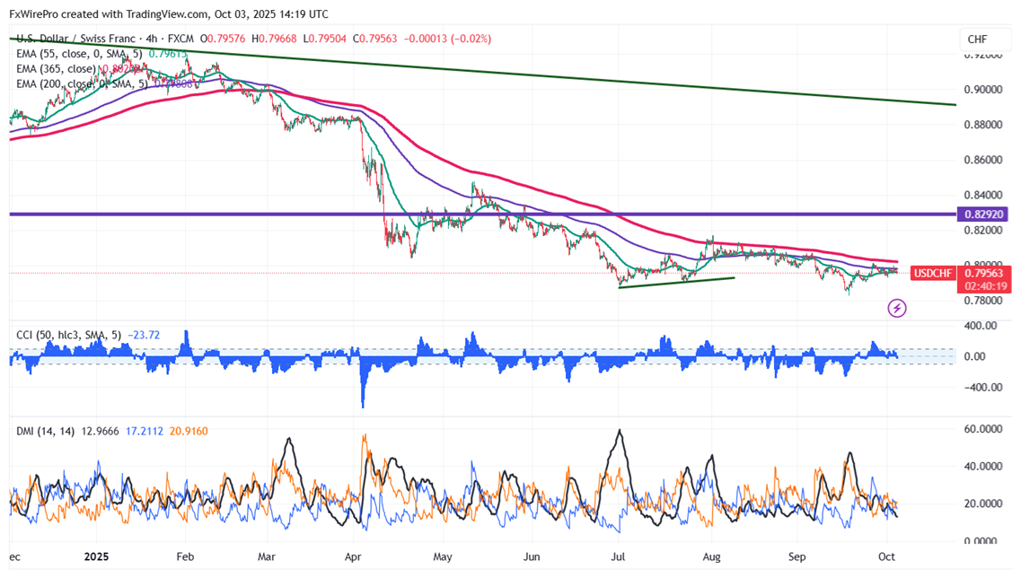 The pair is trading above 55-EMA, below the 200 EMA and 365 EMA on the 4-hour chart, indicating a weak trend. The immediate resistance is at 0.7980; any break above targets 0.8020/0.8070/0.8090/0.8135/0.8170/0.8215/0.8250.