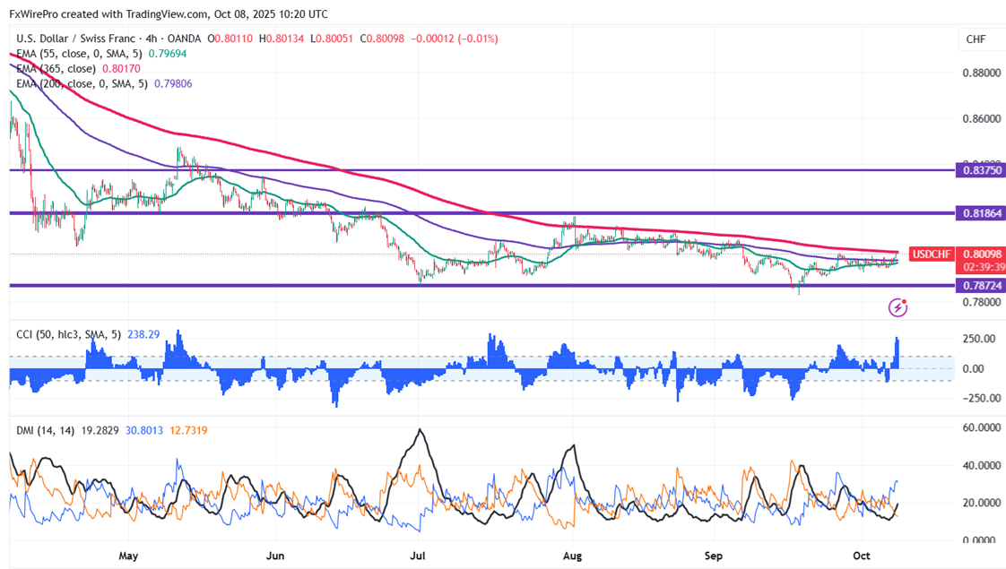 The pair is trading above the 55-EMA, the 200 EMA, and above the 365 EMA on the 4-hour chart, indicating a mixed trend. The immediate resistance is at 0.8020; any break above targets 0.8070/0.8090/0.8135/0.8170/0.8215/0.8250.