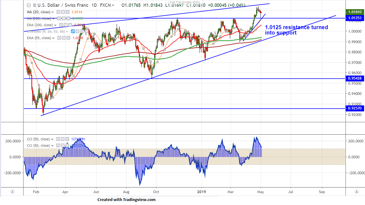 USDCHF has recovered sharply from low of 1.01250 and jumped more than 50 pips. The pair was trading weak for past 1-week and lost more than 100 pips from high 1.02369 highest level since Apr 2017. Fed has kept its rates unchanged and it was optimistic about US economic growth and mentioned that rates to be lower till 2019 on weak inflation.Traders got slightly disappointed as they are looking for hint of rate cut. It hits intraday high of 1.01847 and is currently trading around 1.01808.