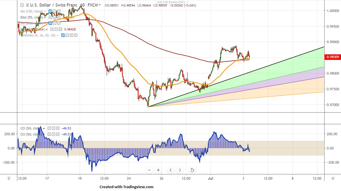 USDCHF has halted its 7 days of a winning streak and lost more than 50 pips from the high of 0.98870 made yesterday. The pair has formed a temporary bottom around 0.96900 and shown good recovery of nearly 195 pips on easing trade war tension. For the past 1-1/2 month Swiss franc was one the best performing asset due to Safe-haven demand. The pair hits intraday low of 0.98345 and is currently trading around 0.98580.