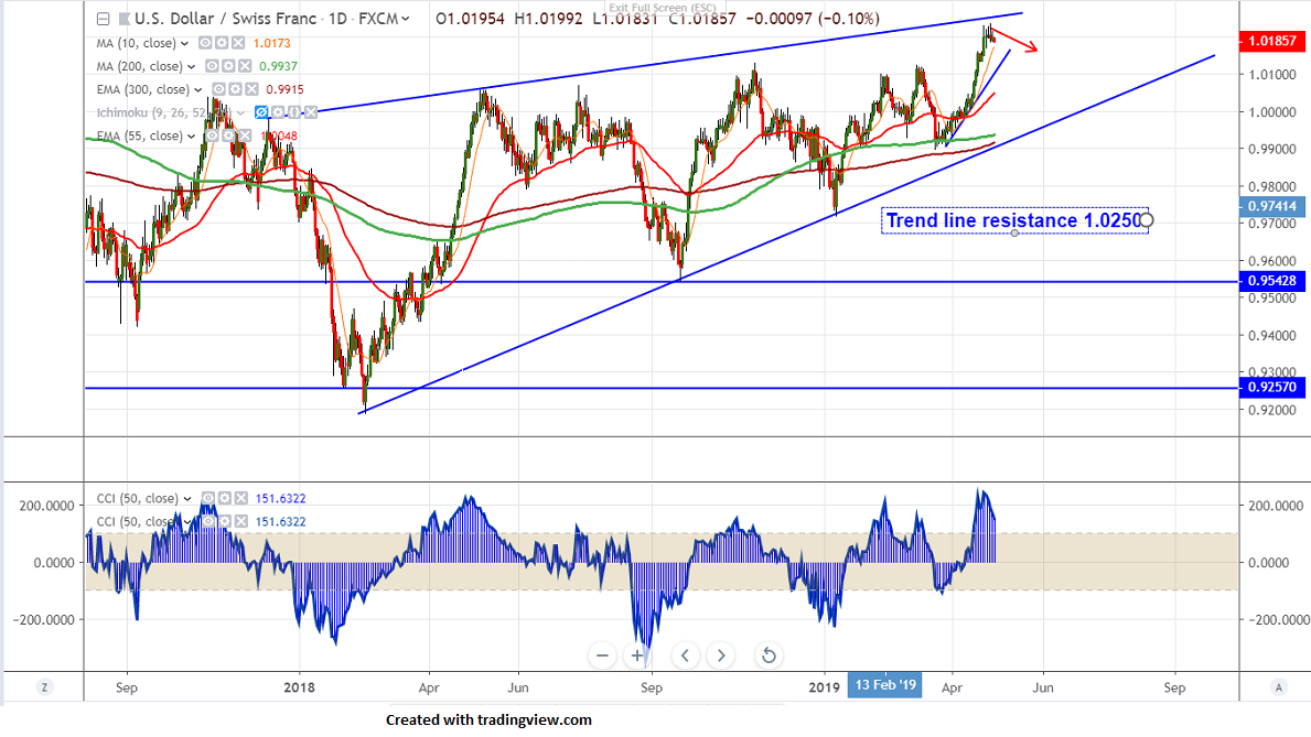 USDCHF has once declined after showing minor jump above 1.0200 level. It hits high of 1.02158 and shown a minor decline from that level.US dollar index halted its one month winning streak and lost more than 50 pips on broad based US dollar selling.US consumer spending jumped 0.9% in Mar compared to forecast of 0.7% highest monthly gains in past 10 years and annual core PCE price index came at 1.6% compared to forecast of 1.7% lowest rate since Sep 2017. Markets eye US Fed monetary policy for further direction.