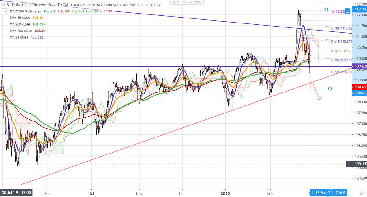 USDJPY continues to trade lower for 5 consecutive days and lost more than 350 pips on the spread of coronavirus. China's National Health Commission said that the figure of new cases increased by 44 and the number of people died rose to 2788. New Zealand and Nigeria have reported the first case infected due to a virus. The pair hits an intraday low of 108.65 and is currently trading around 108.62.