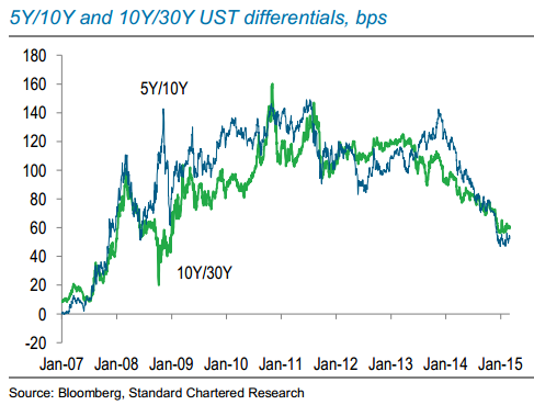 This in turn leads to UST yield curve flattening. In the previous rate-hiking cycle between June 2004 and June 2006, a flattening of the UST yield curve led to a steepening of the credit curve - a trend that is evident now. However, such a steepening will be short-lived, as crowded positioning in the long end will flatten credit curves and they will eventually follow the UST yield curve.