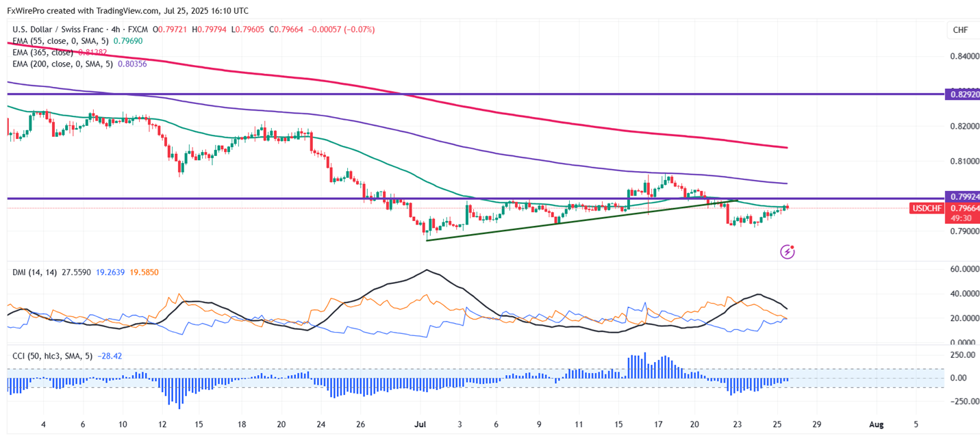 The pair is trading below the 55-EMA, below the 200 EMA, and below the 365 EMA on the 4-hour chart, indicating a bearish trend. The immediate resistance is at 0.7950, any break above targets 0.8000/0.8050/0.8090/0.8140/0.8180/0.8250/0.8300.